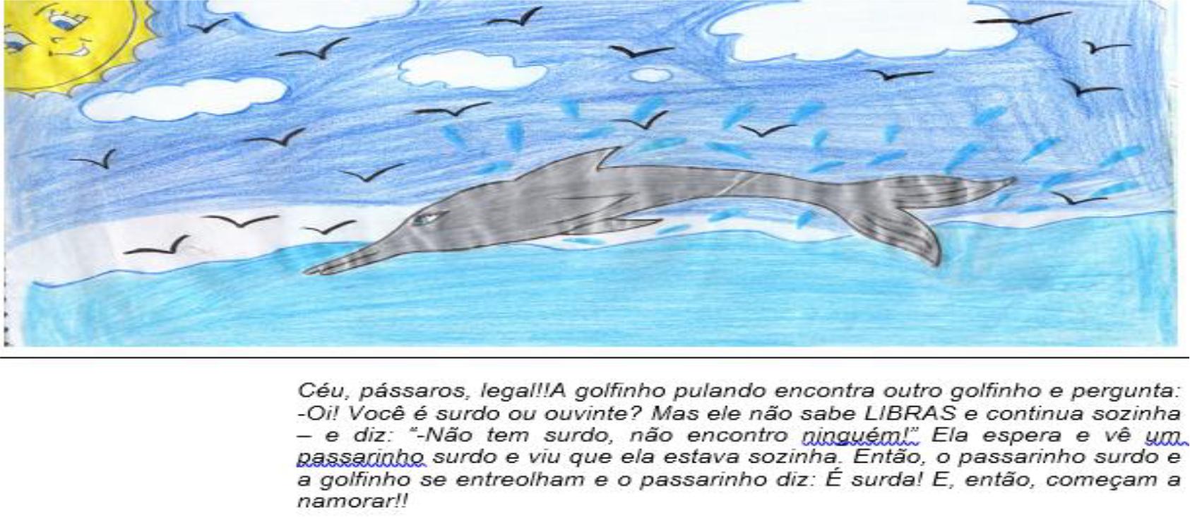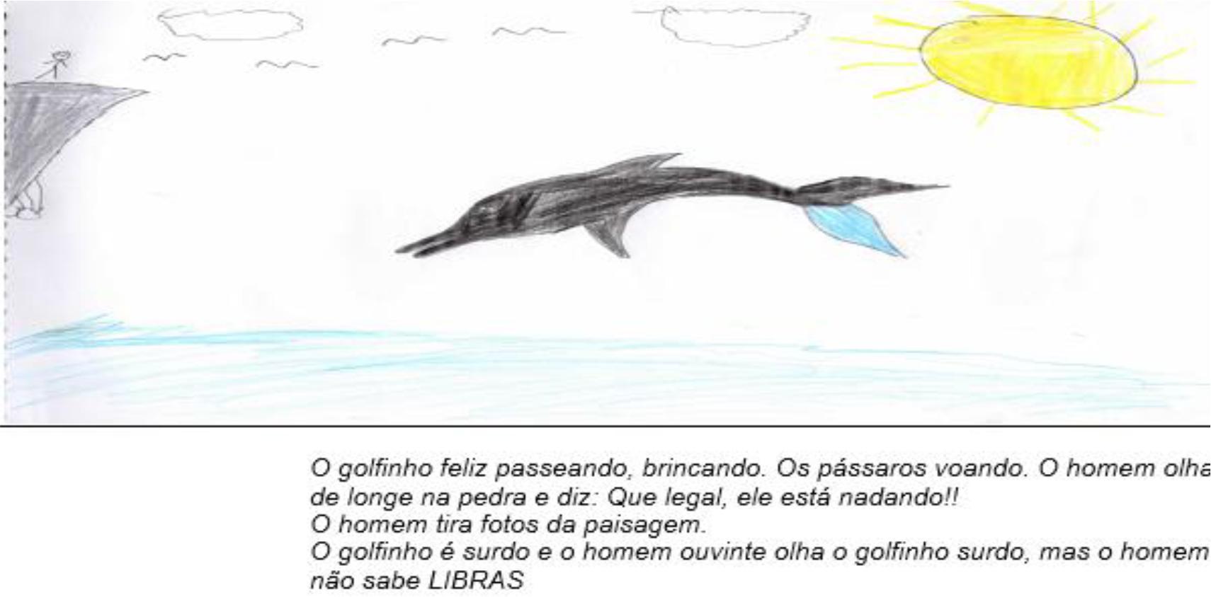Observe-se que nas Figuras 1, 2 e 3 o golfinho é apresentado com identidade surda, utente de Libras e sozinho. Esse é um aspecto recorrente também nos outros participantes surdos; apenas um deles apresenta o golfinho como meio surdo.