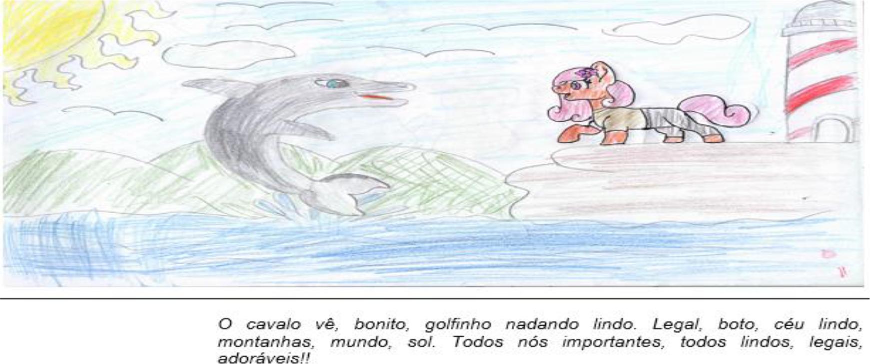 A atividade com a obra O voo do golfinho teve a duração de quatro aulas de 45 minutos cada, durante a disciplina de língua portuguesa. A narrativa apresenta um golfinho que se descobre no desejo de ser pássaro e, ao realizar seu desejo, encontra outros animais que também desejavam se tornar pássaros. A fim de problematizar o momento da interpretação lançamos a seguinte proposta: E se o golfinho fosse surdo, como seria essa história? Propusemos duas opções de manifestação da interpretação do texto: na forma de desenho e/ou escrita.