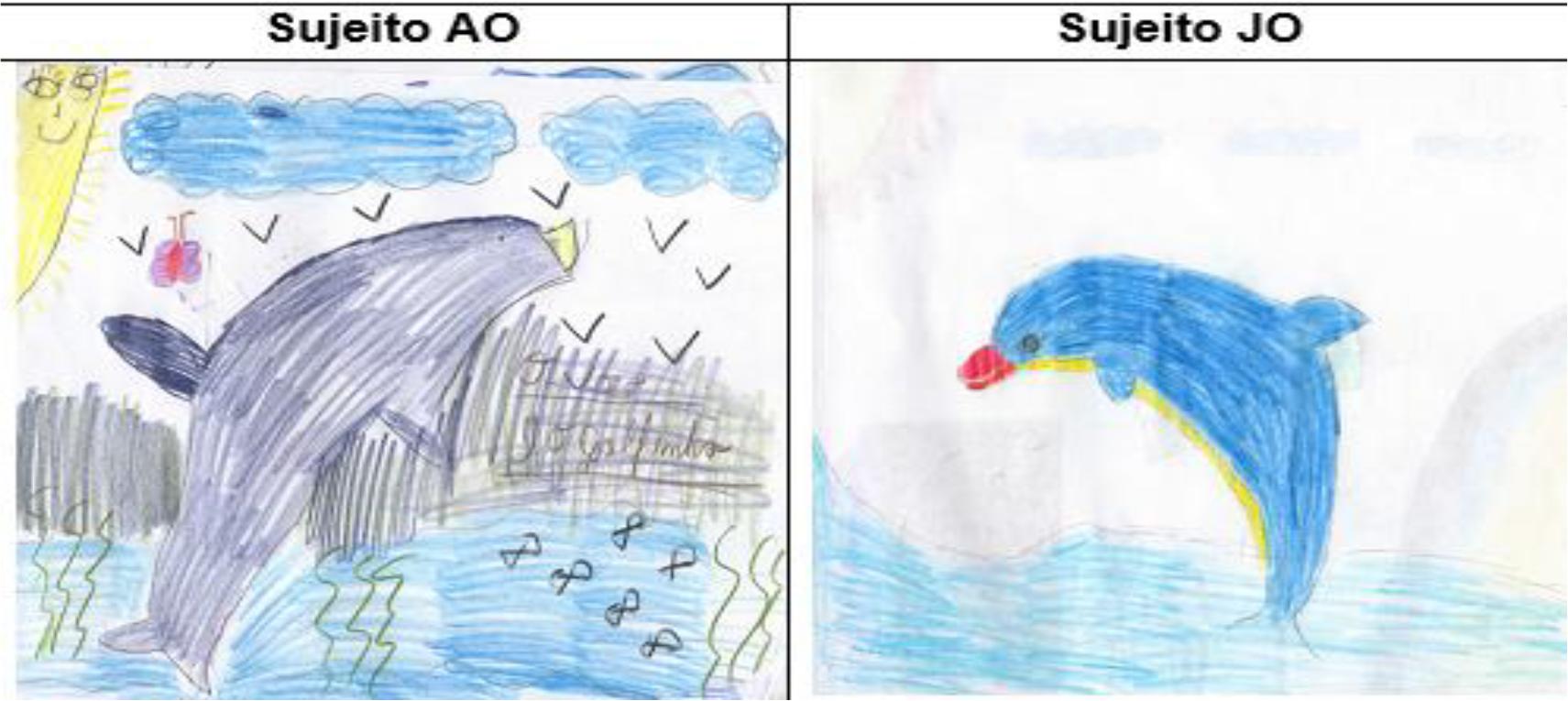 Nos desenhos dos dois sujeitos ouvintes o destaque é evidenciado no bico dos golfinhos. Observe-se que, enquanto para os surdos a base da formação está nas experiências visuais, para os ouvintes a base é constituída por meio da língua oral, portanto, essa vivência é representada no destaque aos bicos dos golfinhos e não em seus olhos. Os objetos de individuação para os sujeitos surdos são diferentes dos sujeitos ouvintes. Essa distinção é evidenciada nos desenhos (olho/boca).