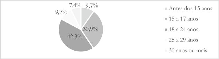 Outro fator investigado com relação à primeira gravidez foi a faixa etária em que as mulheres estavam, neste momento, como revela a Figura 1. A maioria delas (42,3%) tinha entre 18 e 24 anos. Contudo, se agruparmos aquelas que engravidaram dos 15 aos 17 anos com as que foram mães antes dos 15 anos, teremos um quantitativo de 40,6% mulheres que engravidaram no período da adolescência.