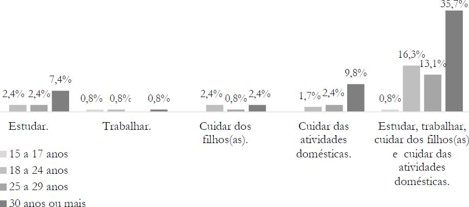 A Figura 2 revela que a maior parte das respondentes (65,8%) concilia estudos, trabalho, o cuidado de filhos e a prática de atividades domésticas. Quando considerados os recortes etários separadamente, entende-se que as mulheres acima dos 30 anos são as que mais estão sobrecarregas (35,7%), circunstância que, de acordo com as pesquisas do IBGE (2019), representa a condição da maioria das mulheres brasileiras.