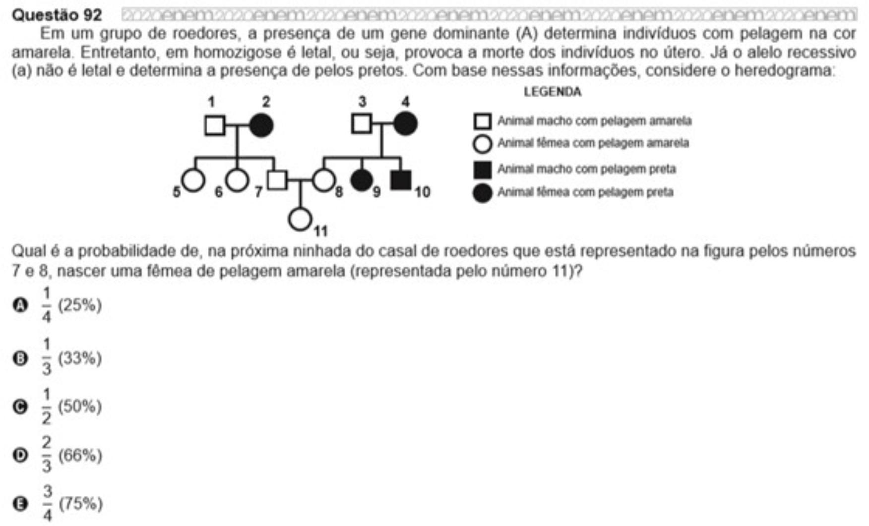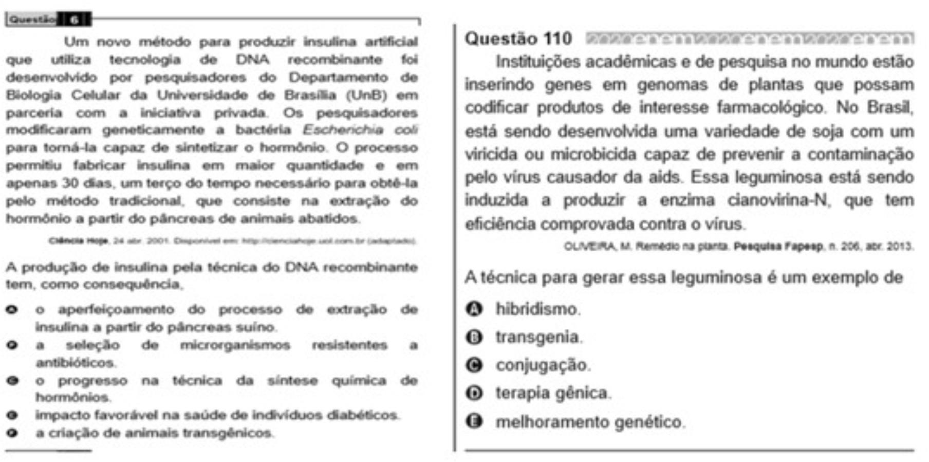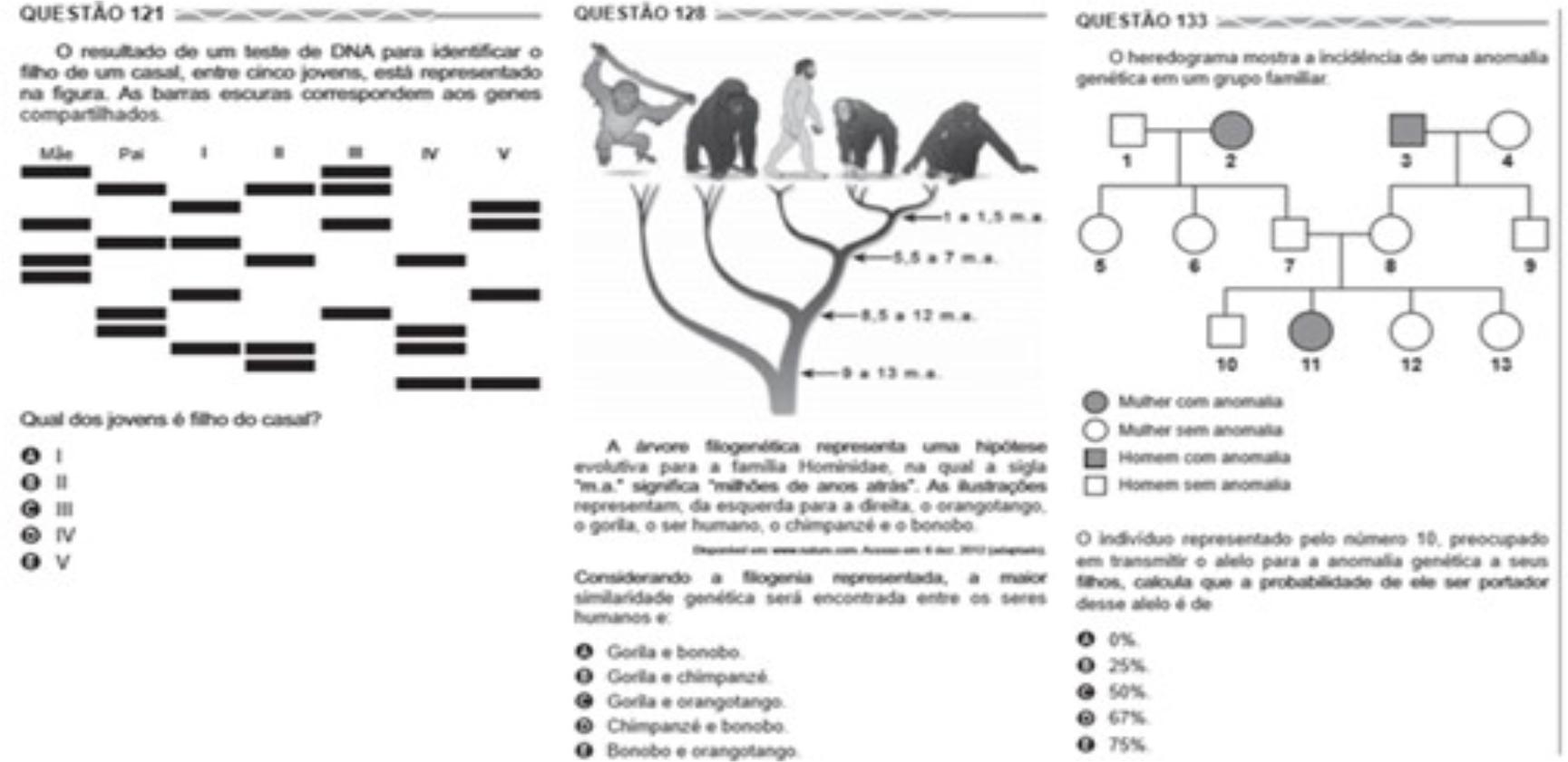 Têm sido bastante comuns comentários positivamente expressos por professores relatando sobre experiências bem-sucedidas em se tratando da utilização da Genética Humana em sala de aula, visto que, dessa forma, o aluno torna-se mais interessado devido à maior facilidade de contextualizar o que se ensina (Camargo, Infante, Malachias, 2007). Essa abordagem é também encontrada no ENEM (figura 9).