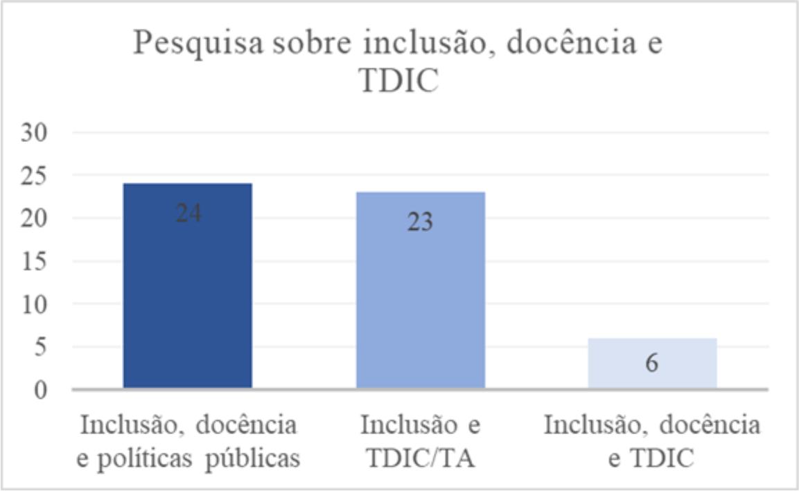 Na fase de refinamento dos dados agrupamos as pesquisas observando a centralidade dos estudos em inclusão e políticas públicas, em inclusão e TA e finalmente aquelas em que houve a articulação entre inclusão, docência e TDIC. Vejamos a figura 1: