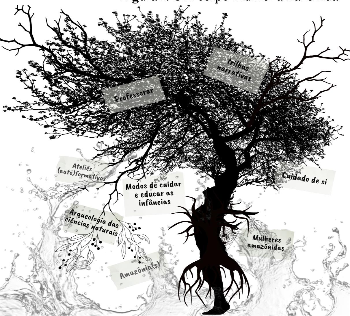 A Figura 1 materializa algumas dessas produções-movimentos do/no Grupo Vidar, os temas discutidos nessa trajetória de mulheres-pesquisadoras na Amazônia. “Um Corpo-Mulher Amazônida” surge em uma biocolagem do si, microscopado da imensidão florestal, fluvial e edafical, em metamorfose consigo e o próprio ambiente. Com seus pés no solo e nas águas, este corpo em meio ao grupo de pesquisa vem marcado por encontros e explode em galhos com os ateliês (auto)formativos, as arqueologias das ciências naturais, as trilhas narrativas e autobiografias, os modos de educar e cuidar as infâncias... Sua medula, suas ramificações nervosas periféricas criam uma associação íntima com o sistema condutor das plantas, transmutam-se com o cuidado de si, as multiplicidades, o professorar, as Amazônia(s), as mulheres amazônidas e destoam de como as pesquisas em educação vem sendo elaboradas, subvertem o ambiente acadêmico. Um micro rizoma florestal feminino que pouco tem a ver com conhecimento arborescente, não fazemos brotar novos saberes, nem enraizamos teoria, nem fixamos metodologia, pretendemos movimentos, explosões, sensibilidades, simbioses com pesquisa-vida, mulher-floresta, galhos-igarapés, virtual-atual.