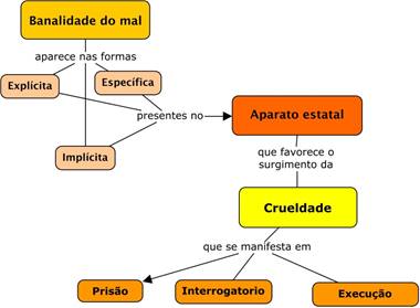 A primeira categoria da análise abrange dois aspectos/conceitos presentes na atuação dos perpetradores de violações aos direitos humanos na ditadura militar brasileira: a banalidade do mal e a crueldade. A banalidade do mal está presente no aparato estatal montado pelo sistema repressor da ditadura militar. Esse aparato permitiu que agentes, em nome do Estado, praticassem graves violações dos direitos humanos na ditadura militar brasileira com crueldade. Ou seja, o sistema montado pelo regime estava baseado no mal banal, no mal administrativo instalado por todas as áreas; foram montadas engrenagens que permitiram ao Estado perseguir os opositores do regime com o intuito de eliminá-los. Esse aparato administrativo possibilitou que agentes militares praticassem atos marcados pela crueldade com as vítimas, identificadas como inimigas (Ver Figura 1).