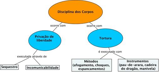 A análise das ações penais aponta que, no regime militar brasileiro, a tortura e a privação de liberdade são os principais meios utilizados para a obtenção de informação para o aparato estatal. Na disciplina, o regime militar fabrica corpos dóceis, submissos. Isso ocorre através da prisão das vítimas, levadas muitas vezes para os centros de repressão, onde passam por interrogatórios nos quais são utilizados métodos de tortura para extração de informação (Ver Figura 2).