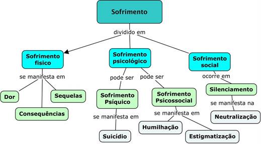 A experiência das vítimas dos agentes do sistema repressivo do regime brasileiro está marcada pela dor e sofrimento, ferimentos e medo, hematomas e vergonha. Na análise desta categoria foi utilizada a tipologia do sofrimento proposta por Renault (2017), segundo o qual, ele está inicialmente dividido entre sofrimento físico, sofrimento psicológico e sofrimento social. Na análise das ações, o primeiro tipo aparece em danos, consequências e sequelas. O sofrimento psicológico é subdividido em sofrimento psíquico (que apareceu na forma de suicídio tentado e consumado) e psicossocial (que emergiu dos dados como humilhação e estigmatização) (Ver Figura 3).