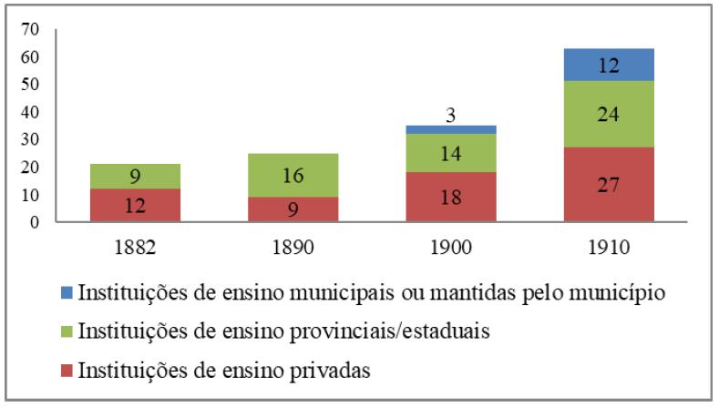 Nos anos 1880, houve aumento de 11 instituições, 13 para 24, o que representa uma variação percentual de crescimento de 84,61%. Afere-se que, até 1885, a maioria dos estabelecimentos de ensino era privado - particulares e confessionais - e no ano de 1886 tinha o mesmo número de estabelecimentos públicos provinciais - na cidade e bairros rurais - e privados. A partir de 1887 ocorreu um movimento que levou ao aumento das escolas públicas e diminuição das privadas. Todas as provinciais eram cadeiras3 primárias e dentre as privadas estavam desde pequenas aulas e escolas, estabelecimentos de médio porte e dois de grande porte, com as modalidades jardim de infância, ensino primário, ensino secundário e preparatórios, nos horários diurno e noturno. Em ambas as categorias havia educação feminina, masculina e mista (Gazeta de Piracicaba, 1882-1889; Livros de Atas da Câmara Municipal de Piracicaba, 1880-1889).