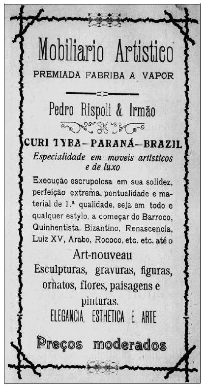 Pedro Rispoli foi um imigrante italiano que desembarcou no Brasil em 1895. Três anos depois, seu registro civil já era mencionado no jornal A República: “vinte e quatro anos, filho de Ângelo Rispoli, casado, artista e morador da Rua Riachuelo” (A República, Alistamento Eleitoral, 1898, p. 2). Na capital paranaense, Pedro Rispoli era proprietário do “Mobilário Artistico”, uma fábrica a vapor que além de confeccionar “qualquer estylo2 de móveis” (A Notícia, Anúncios, 1906, p. 3), também se dedicava a reparos de instrumentos musicais, e a um grande estoque de madeiras e móveis de pinho e imbuia (A Notícia, Anúncios, 1906, p. 3).