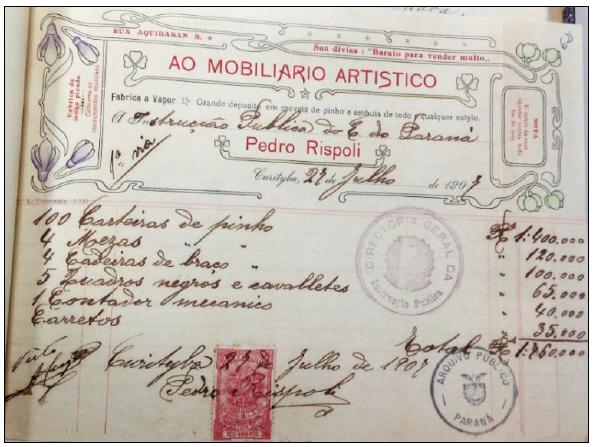 From this perspective, Pedro Rispoli’s refined carpentry seemed to be in tune with the material and hygiene requirements that the educational actors sought for the installation of new schools. The first indication of the refined character that draws our attention in Pedro Rispoli’s production is the receipt for his commercial enterprise, a delicate piece of paper measuring 16 centimeters in height and 21 centimeters in width. In Figure 1, we will pay attention to other characteristics of the receipt that may provide clues about the style used by Pedro Rispoli in the manufacture of his furniture:
