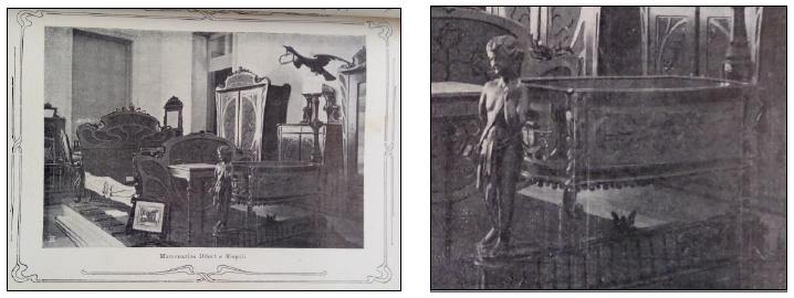 Regarding this issue, Sandra Jatahy Pesavento (1997, p.14) highlights that the exhibitions functioned “as a synthesis and externalization of the modernity of the ‘new times’ and as a showcase for the inventions and goods made available to the world by the factory system”. In the case of Paraná, Pedro Rispoli’s Mobiliário Artístico represented both common and luxury furniture, displaying living room furniture made of “multicolored acouta-cavallo4, consisting of: 1 sofa, 6 simple chairs, 2 armchairs and a centerpiece” (Martins, 1908, p.50). However, the artifact that most caught the attention of the Rio de Janeiro community was the crib featured in the aforementioned photograph (Figure 2). It was made of imbuia wood, “with allegories in bas-relief” (Martins, 1908, p.50). If we observe the columns supporting the crib, we can notice the carved stem ornaments, in addition to the representations of foliage and other vegetation on the side of the furniture, which may indicate an Art Nouveau design. The furniture in the exhibition room itself bears traces of Art Nouveau, with inlays and carvings that accentuate the sinuosity, curves and stem-shaped supports.