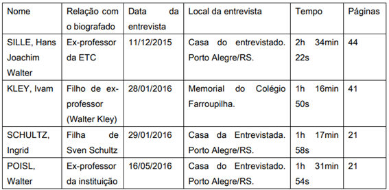 Como se observa no Quadro 1, foram realizadas quatro entrevistas. Uma delas com a filha de Sven Robert Schulze, Ingrid Schulze; duas com sujeitos que foram colegas de trabalho do professor Schulze e; uma com filho de um colega já falecido. Dentre as entrevistas com os antigos colegas de trabalho encontra-se a que foi realizada com o professor Hans Joachim Walter Sille 10 e com o professor Walter Poisl. Além disso, entrevistou-se Ivam Kley, filho de Walter Kley, professor já falecido. De forma geral, as entrevistas produzidas resultaram em um total de 6h 40 min 54s de duração e 127 páginas, salvaguardados no acerco pessoal dos autores.