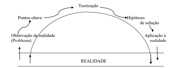 Quando existir algo que esteja suscitando a busca de informações e soluções, pode ser utilizada a metodologia da problematização com o esquema de Charles Maguerez, denominado Método do Arco, que sofreu algumas adaptações de conteúdo por Bordenave e Pereira. São cinco etapas do Arco de Maguerez, conforme Fig. 1, no qual os participantes realizam ações que possibilitam o exercício da práxis refletida, informada, consciente e intencionalmente transformadora (BERBEL, 1995):