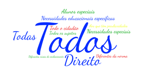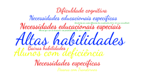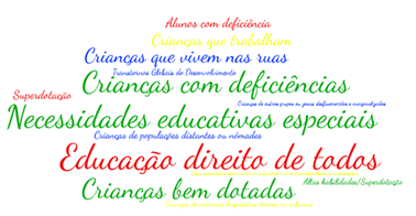 Nas duas figuras acima, é possível perceber que os docentes descreveram os públicos referenciados em três dos documentos que são frequentemente citados em pesquisas a respeito da EE e EI: A Constituição Federal de 1988 (Brasil, 1988), a Declaração de Salamanca (Unesco, 1994) e a Política Nacional de Educação Especial na perspectiva da Educação Inclusiva (Brasil, 2008). Na figura 3 representamos, por meio de uma nuvem de palavras, o público descrito pelos três documento supracitados (Figura 3):