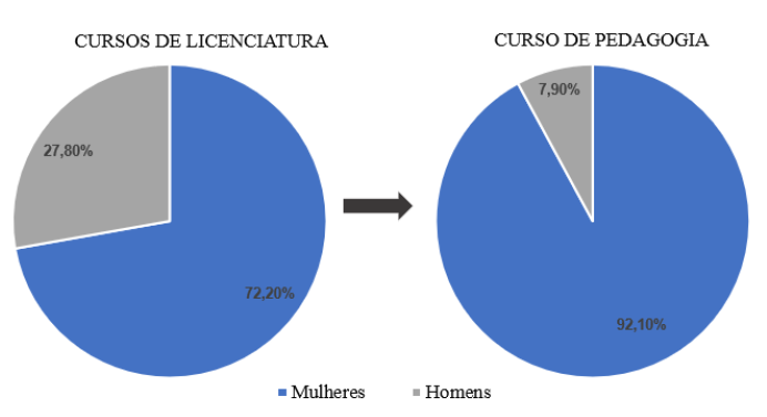 Como elucidado na seção anterior, a feminização do magistério é resultado de um processo histórico contínuo. Isso corrobora para que, atualmente, a predominância de mulheres que realizam o curso de Pedagogia e, posteriormente, buscam atuação profissional na Educação Infantil, ainda seja muito acentuada, comparando-se ao baixo número de homens em ambos os ambientes e contextos.