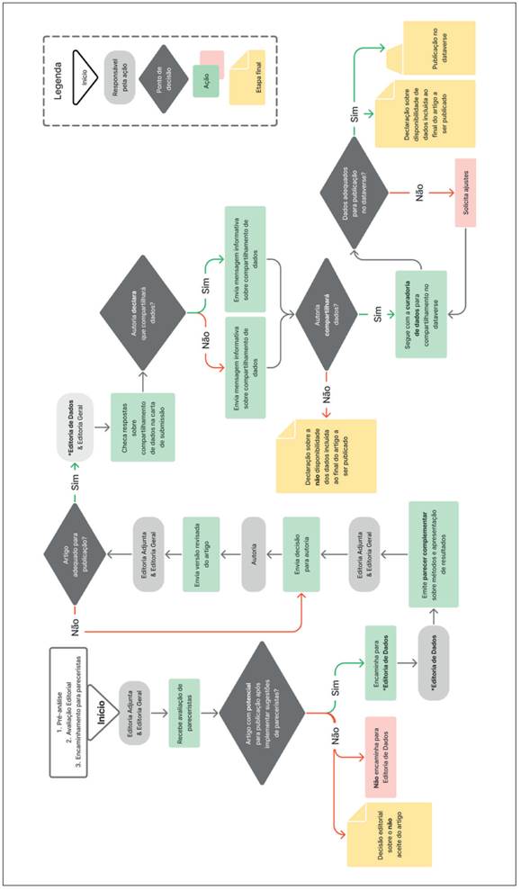 Adicionalmente, estabelecemos e estruturamos uma Editoria de Dados dedicada a revisar e aprimorar constantemente nossa política editorial para compartilhamento de dados (Figura 1). Suas atividades englobam desde a avaliação da possibilidade de compartilhamento de dados, incluindo a definição do nível de abertura e a forma de disponibilização, até a verificação de eventuais pendências na comunicação da parte metodológica e de representação dos dados. Além disso, a Editoria de Dados emite eventuais pareceres complementares à Editoria Adjunta e, quando oportuno, convida as pessoas autoras a compartilharem seus dados. Posteriormente, realiza a curadoria dos dados e presta auxílio às pessoas autoras no processo de compartilhamento, culminando na publicação dos dados no Dataverse da revista.10