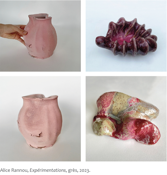Ici, il était plutôt question d’”improviser” - surtout pour cette étudiante, mais aussi pour l’enseignant. La notion d’”improvisation” est au cœur du troisième essai de Rancière (1987, pp. 77-124). Il y montre que la vertu première de l’intelligence humaine est la vertu poétique, au sens grec du terme, celle de la venue à l’être de ce qui n’existait pas encore auparavant. Improviser, ce n’est pas uniquement chercher à établir des vérités de façon erratique ou au petit bonheur la chance. Dans l’improvisation, et là est l’essentiel, “ la pensée ne se dit pas en vérité, elle s’exprime en véracité” (p. 106). Parfois, l’élève sent ou pressent des idées, mais il ou elle a du mal à les dire ; certes, souvent parce que son esprit est encore confus, mais aussi et surtout parce qu’il s’agit de construire un discours à partir d’intuitions pratiques et de pratiques intuitives. Impossible encore, à ce stade de la réflexion de formuler une idée juste, précise et claire, c’est-à-dire une vérité. La véracité désigne ici davantage une conviction intime et une intention dans un projet expérimental, la volonté de mettre au jour quelque chose qui n’a pas encore été révélé, mais qui mérite de l’être. L’idée est là, comme en attente ou plutôt en gestation, que ce soit globalement dans le contexte social ou sociétal qui est le nôtre (l’époque metoo, la volonté de s’émanciper du male gaze, la recherche de réappropriation du corps des femmes par elles-mêmes,...), mais aussi dans l’univers plus personnel de l’étudiante, celle d’une jeune femme en quête d’épanouissement, tant sur un plan intellectuel que physique. Charge à elle de participer à l’élaboration et à l’advenue d’une idée ou vision nouvelle, de la formuler alors qu’elle n’est encore qu’en fermentation (dans son esprit et dans l’esprit du temps) et d’en montrer la pertinence. C’est en ces termes qu’elle exprime ses intentions en tant que conceptrice d’objets céramiques : “il s’agit de convoquer la capacité du pouvoir sensoriel et sensuel de la céramique au travers de formes, textures et couleurs, en envisageant des modes de représentations variés qui ne soient pas seulement figuratifs tout en mettant l’accent sur le dialogue que peut susciter cet objet”.