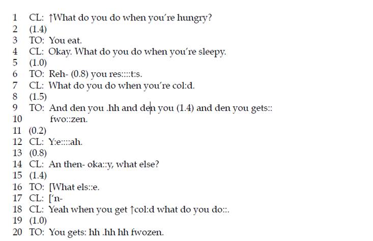 The answer to the question in line 7 is notable. Although the suggested answer is “what to do,” Tony answers with the generic consequence (“You gets fwozen (frozen)” in lines 9-10, 20). This answer is slightly strange, but it is natural as a sequence turn. Maynard (2005) pointed out that “the interpretive practice that Tony employs when he answers incorrectly can in some sense be located within ordinary commonsense competence” (p. 516).