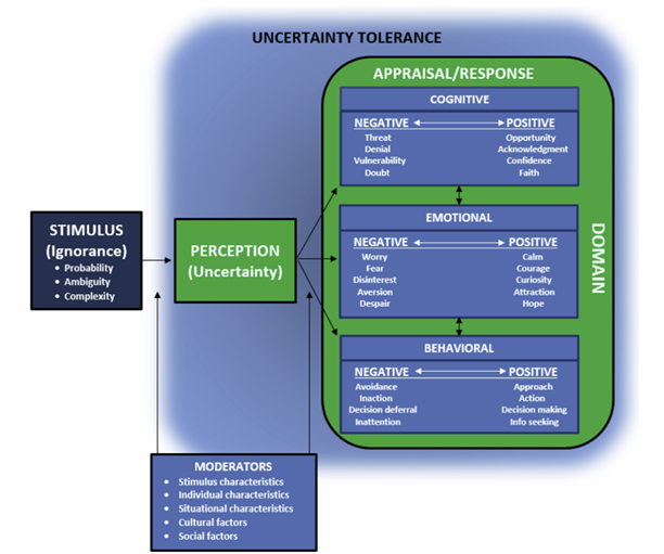 Uncertainty can be aversive; large bodies of research from multiple disciplines have demonstrated that uncertainty provokes fear, worry, anxiety, perceptions of vulnerability, and avoidance of decision-making (Babrow, 1992). On the other side, uncertainty can appear to be a vital engine for research; it is a cognitive sensation that penetrates the human being in a subjective experience of wondering and doubting (Hillen et al., 2017; Tauritz, 2019). Individuals thus engage in a variety of different responses to both minimize the negative effects and maximize the positive effects of uncertainty (Hillen et al. 2017). Coping with uncertainty becomes very useful and it is an all-encompassing phenomenon including tolerance of ambiguity as well as other potential sources of uncertainty, such as probability (Taleb, 2014) and complexity (Gershenson, 2013).