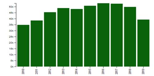 Figura 1 Número de Trabalhos disponíveis por ano no BNDT entre 2010 e 2019.