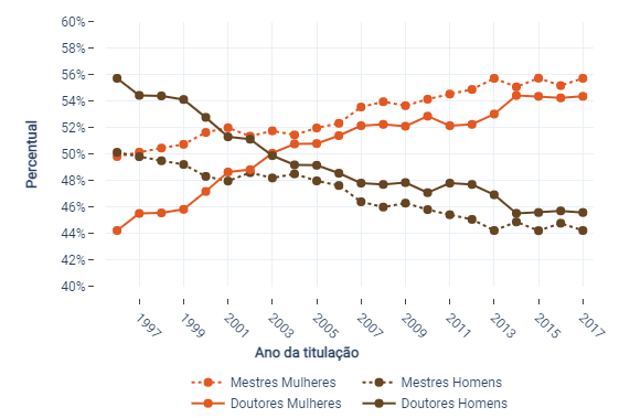 Apesar de osnúmeros seguirem a tendência nacional, marcada por uma inversão no perfil dos pesquisadores brasileirosnas duasúltimas décadas,porém, situam-sebem acima da médiaque registra54%4 do total de trabalhos no Brasil de autoria feminina (Figura 03).