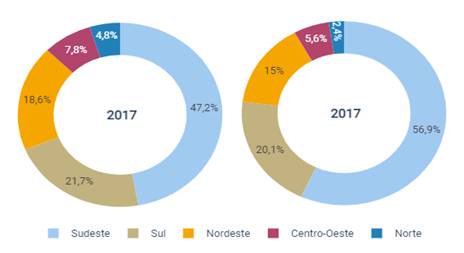 Figura 4 Número de dissertações e teses, defendidas respectivamente, por regiões do Brasil 2017.