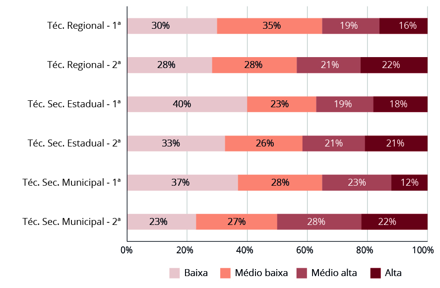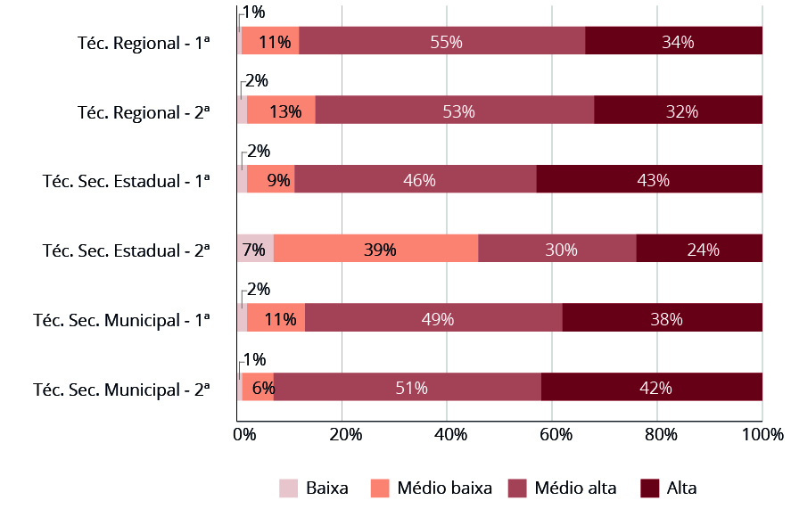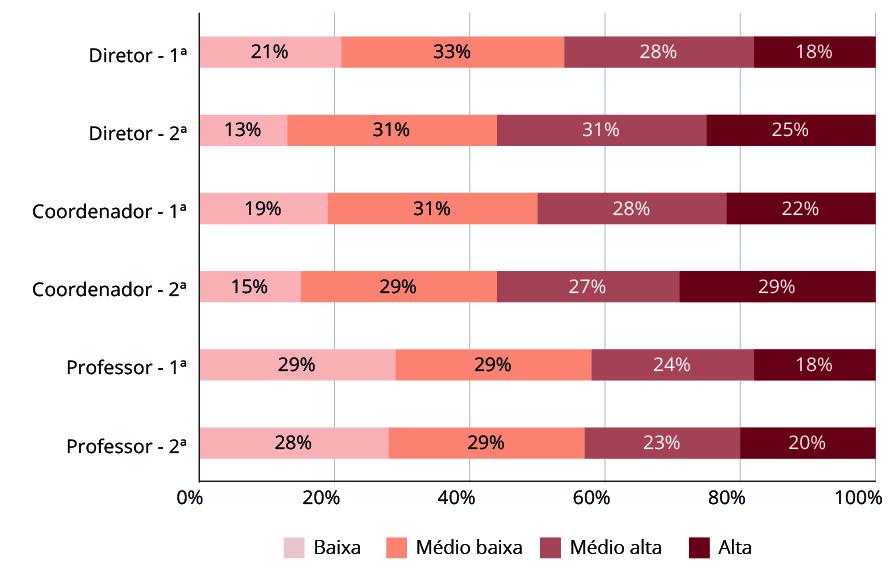 Os Gráficos 1 e 2 apontam que entre a primeira e a segunda aplicação houve uma evolução positiva da participação dos profissionais nas atividades consideradas. Para facilitar a exposição, os dados são apresentados em dois grupos, que tratam dos três profissionais que atuam na esfera da secretaria e dos três que atuam na esfera da escola. No Gráfico 1, observa-se que o percentual de todos os sujeitos nas faixas média alta e alta expandiu, sendo o mais significativo o dos técnicos da secretaria municipal, que aumentou de 35% para 50%. No Gráfico 2, o maior salto é verificado entre os diretores, com 56% nas faixas média alta e alta (contra 46% na aplicação anterior). Mas não se pode deixar de destacar que os professores têm uma participação média e alta de 42% na primeira aplicação e de 43% na segunda5.