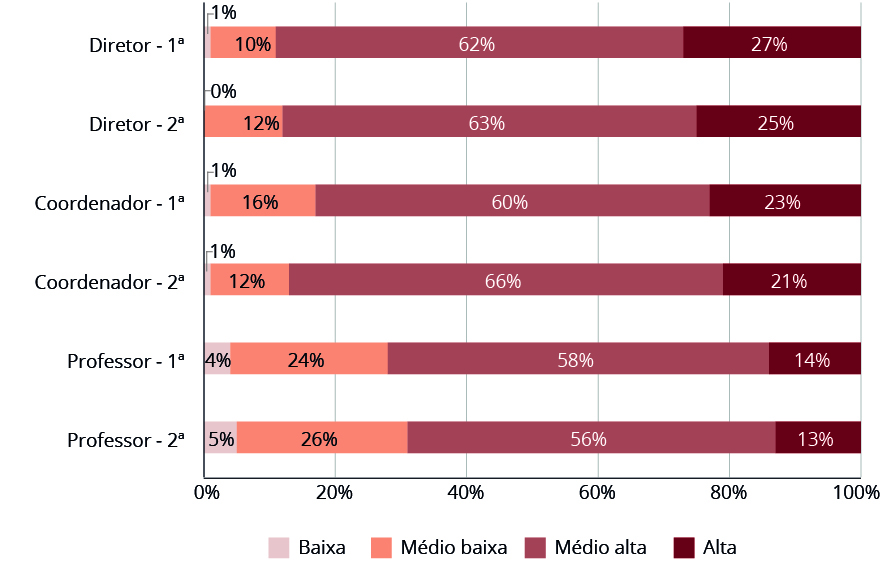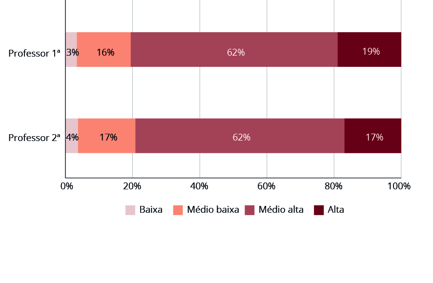 Em outra seção do questionário aplicado aos profissionais, investigaram-se os efeitos da Base sobre a percepção a respeito da centralidade do currículo. Os resultados demonstram que todos os profissionais têm uma percepção positiva, sendo especialmente relevante frisar que 70% dos professores nas duas aplicações se encontram nos níveis médio alto e alto dessa escala. Por fim, submeteu-se exclusivamente aos professores uma bateria que indagava sobre os efeitos da Base em sua prática profissional. O Gráfico 5 assinala uma resposta muito assertiva dos docentes, ficando a percepção média alta e alta próxima de 80% nas duas aplicações.