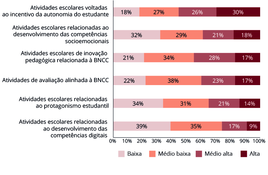 O que diz respeito a inovações pedagógicas relacionadas à BNCC, que contempla itens como a participação dos estudantes em atividades em grupo, conversas e debates; em atividades com uso de recursos tecnológicos; em atividades práticas e de pesquisa; em atividades que mobilizam a criatividade; que tratam dos direitos e deveres dos cidadãos; dos problemas e questões locais, entre outros temas caros à BNCC. Nesse caso, 45% ficam nas faixas média alta (28%) e alta (17%).