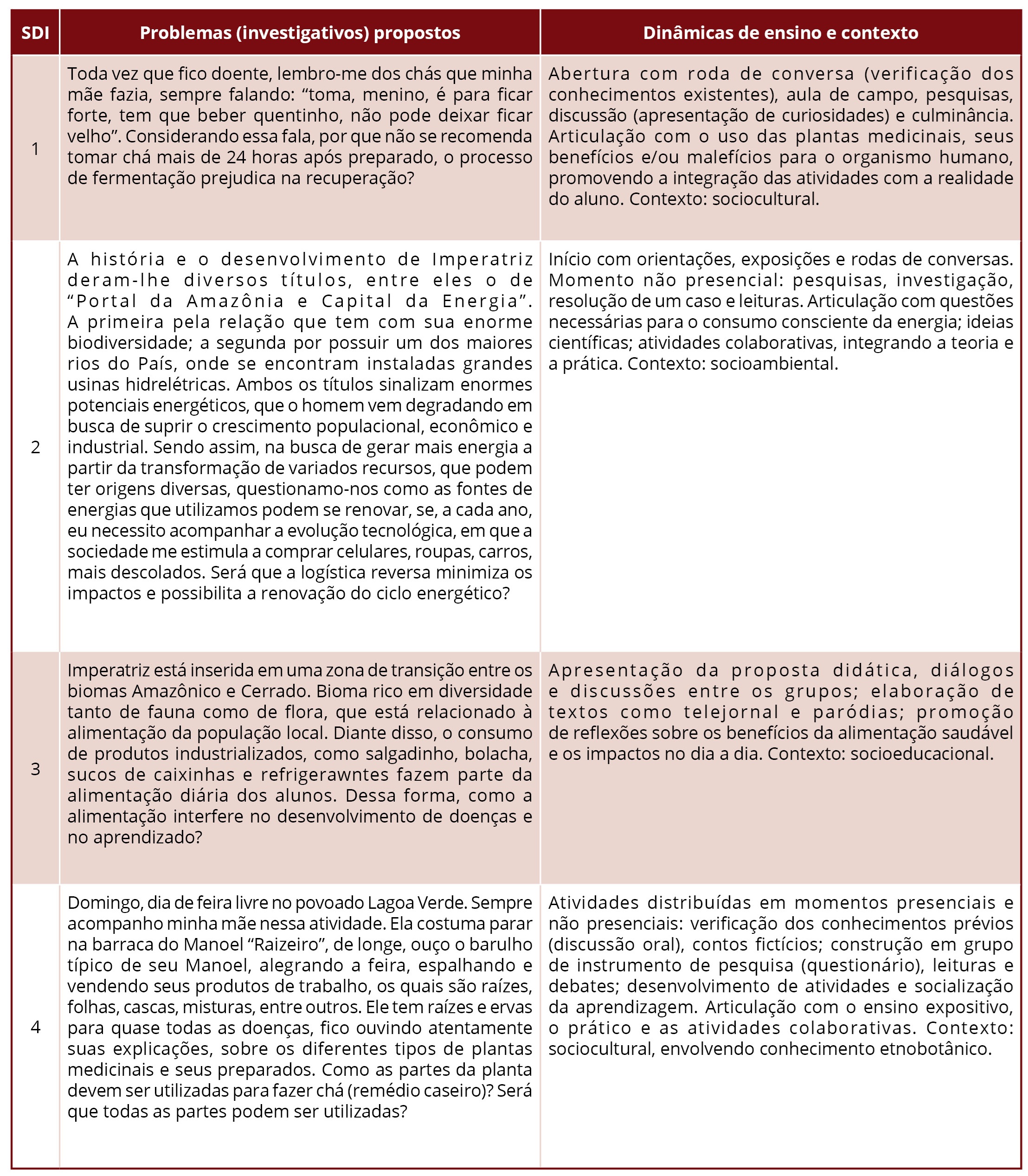 De acordo com os autores, as discussões socioambientais possibilitam “contextualizar as situações-problemas”, despertando a curiosidade e a participação dos alunos para o aprendizado, como também oferecem subsídios sobre o tema e estimulam “discussões baseadas em argumentos”, ampliando os conhecimentos e resultando em “mudança de valores e atitudes individuais e coletivas” (Passeri; Rocha, 2017, p. 8), o que consideramos não diferir dos objetos de conhecimentos abordados nas SDIs dos participantes.