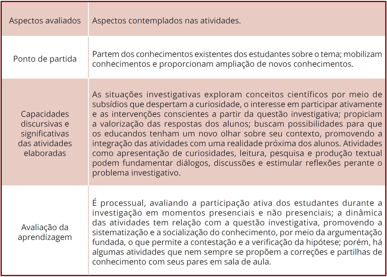 No tocante à avaliação da aprendizagem, descrita no Quadro 2, ela se deu de forma diversificada, desde que assegurasse a participação ativa dos estudantes e os argumentos fundados na resolução da questão investigativa.