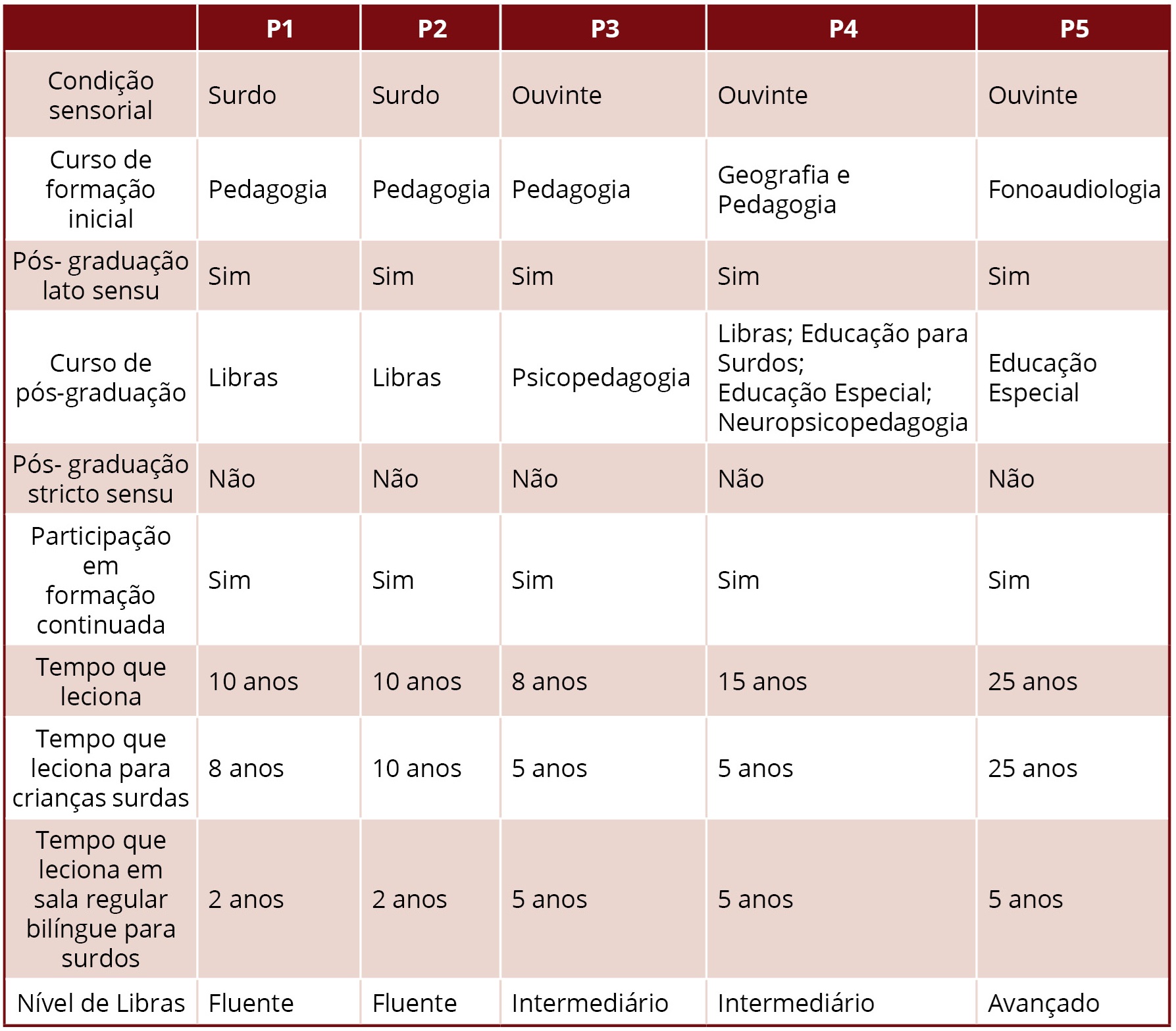Inicialmente, foram recrutados oito voluntários com perfil coerente para participar do estudo, entretanto, apenas cinco professores bilíngues se voluntariaram a participar. Para manter o anonimato dos participantes, iremos nos referir a eles como P1, P2, P3, P4 e P5. É importante destacar que as portarias de organização das turmas preveem, no máximo, dez estudantes em cada uma das SRBS. No entanto, por se tratar de um serviço recente, esse número ainda não foi atingido, apresentando, em algumas SRBS, um efetivo de apenas três estudantes por sala.