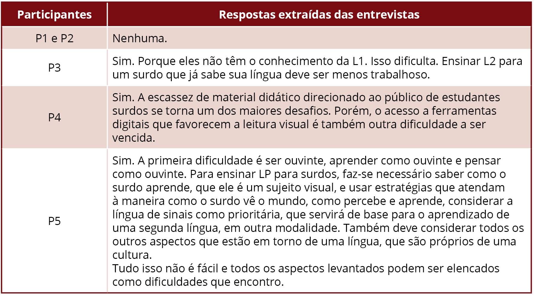 Embora ambos, P4 e P5, tenham respondido que têm dificuldade para ensinar a língua portuguesa escrita como segunda língua a estudantes surdos, P4 citou apenas a escassez de material didático, enquanto P5 ressaltou a necessidade de conhecer como o surdo aprende, da mesma forma que a sua condição de sujeito visual como algo crucial para se pensar em estratégias. Logo, o pensamento de P5 corrobora o que Quadros e Schmiedt (2006) defendem.