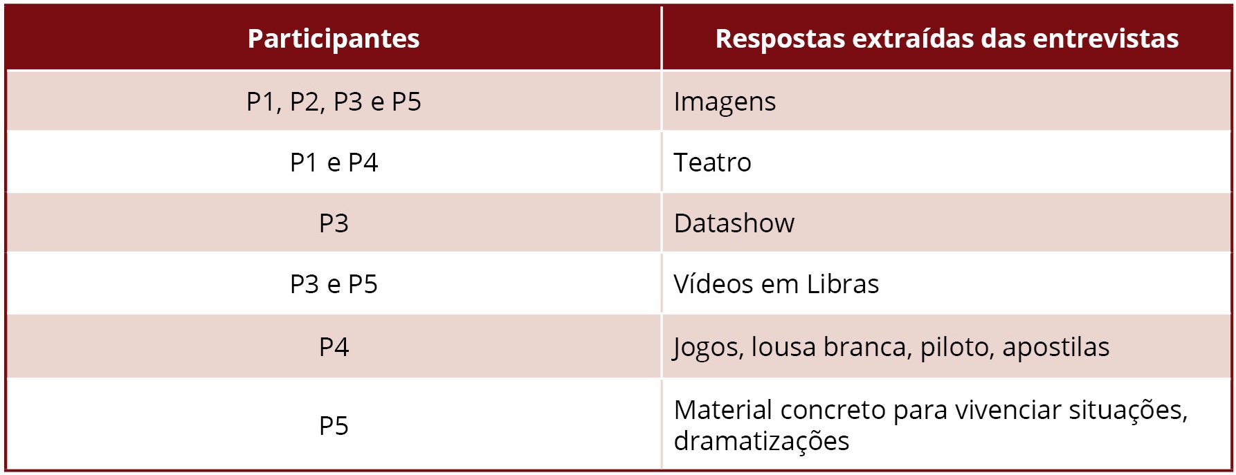 Os materiais concretos e as dramatizações, como aponta P5, são recursos também destacados como facilitadores no ensino da língua portuguesa a crianças surdas nos estudos de Sousa (2021).