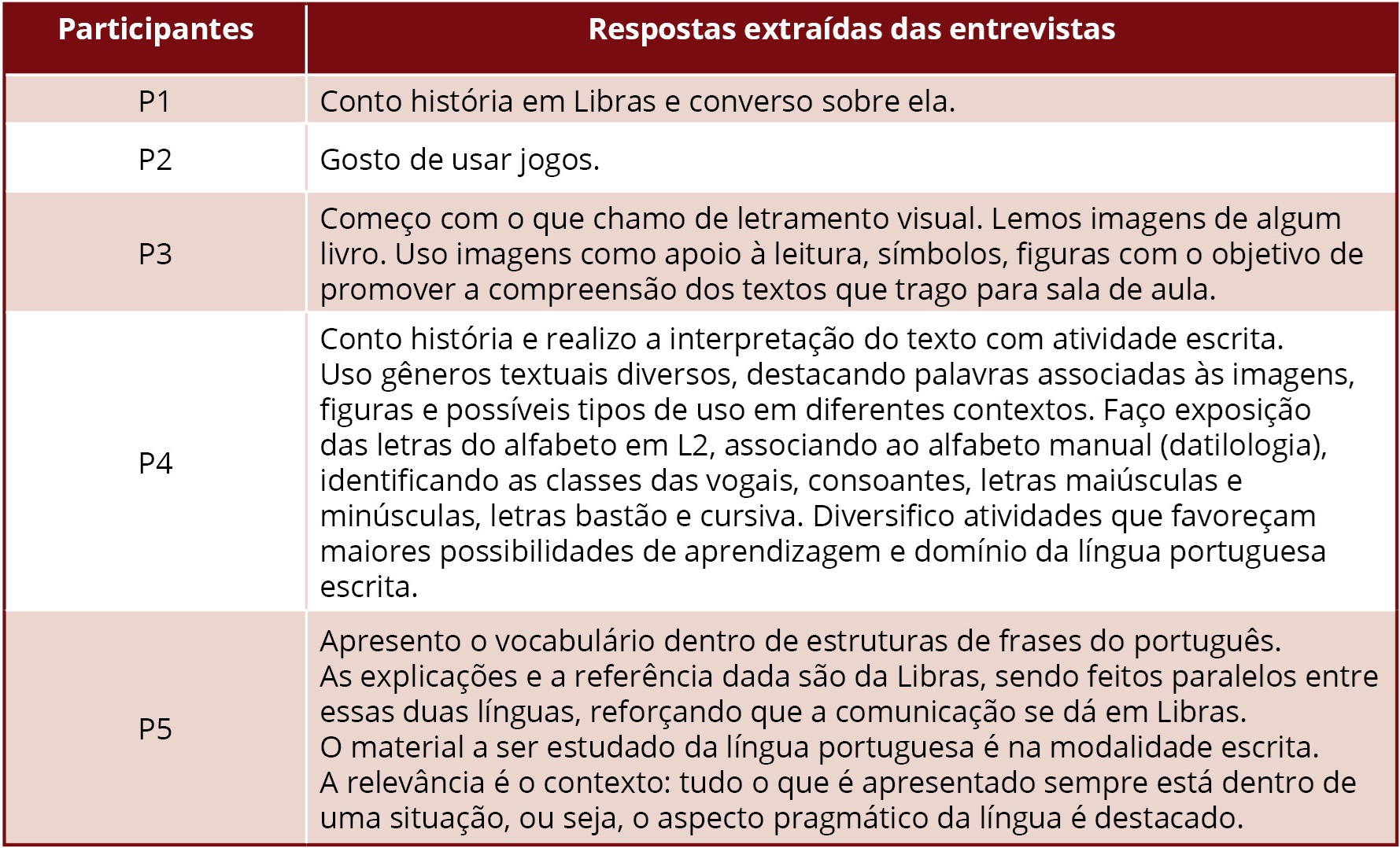 A seleção de falas com informações pertinentes será exposta em quadros com base em cinco categorias temáticas: dificuldades no ensino da língua portuguesa escrita; ensino da língua portuguesa escrita nas SRBS; práticas de letramento no ensino da língua portuguesa para surdos; aquisição da língua portuguesa escrita: estudante surdo versus ouvinte; língua de sinais como língua de instrução.