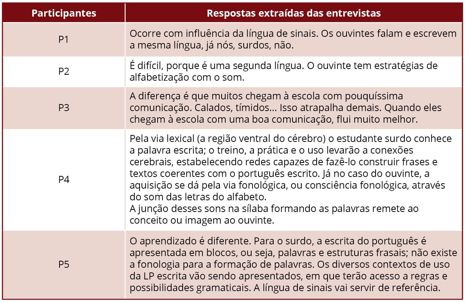As respostas de P2, P4 e P5 comungam da mesma afirmação de Silva (2021), ao defender que os surdos compreendem a escrita diferentemente dos ouvintes, tendo em vista que não ocorre a fonetização.