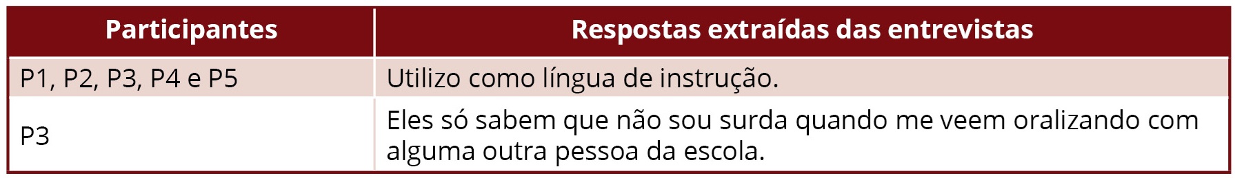 O Quadro 6 evidencia a síntese das respostas dos participantes sobre como a língua de sinais é utilizada por eles em sala de aula, ou seja, se é usada como língua de instrução ou apenas, esporadicamente, como estratégia de apoio.