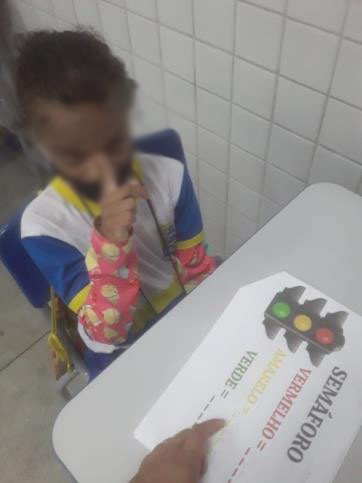 Na Figura 3, registramos uma situação, em outra sala de aula, em que a criança faz uso da datilologia, ao refletir sobre a leitura e, posteriormente, a escrita de algumas palavras em língua portuguesa.