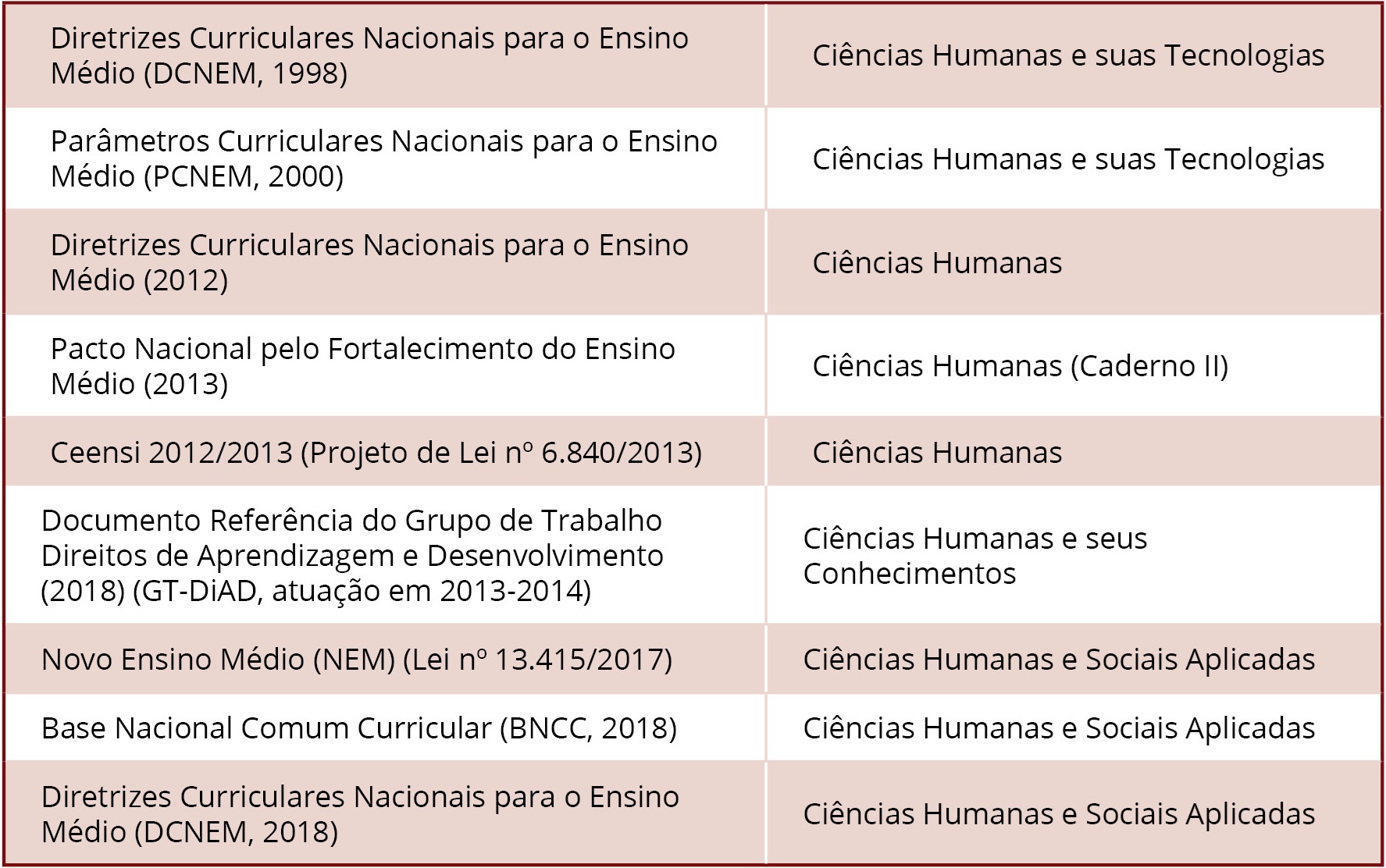 Quadro 1 Nomenclatura da área de Ciências Humanas em documentos curriculares no período de 1998 a 2018