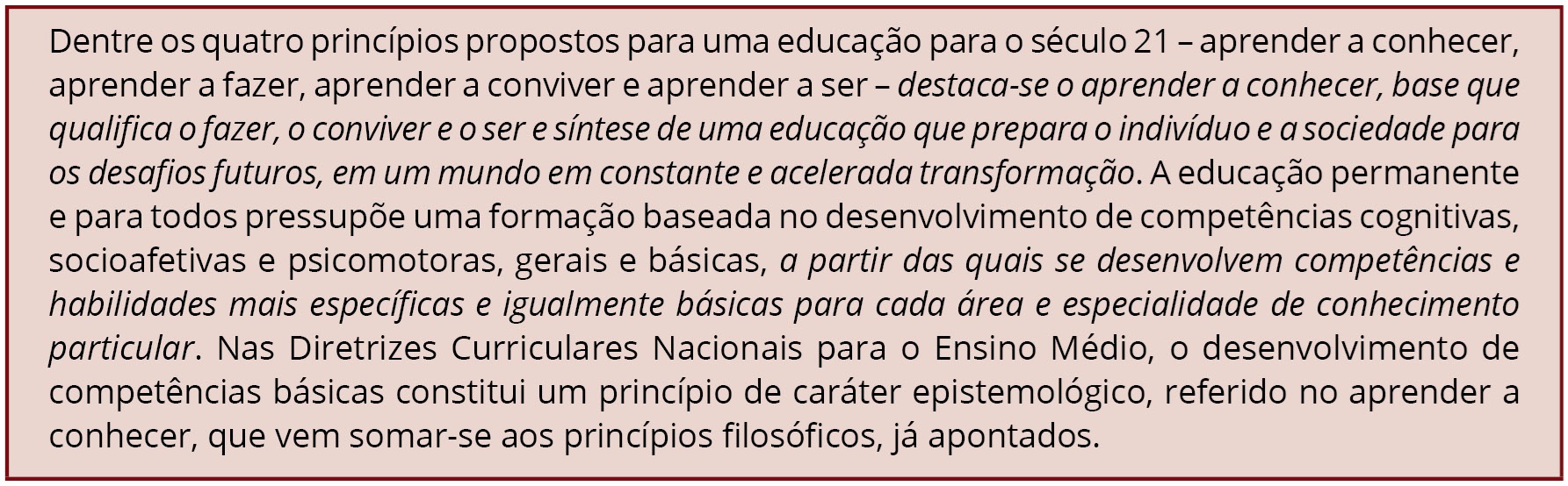 Na redação do primeiro trecho em destaque, há o verbo conhecer, e não o substantivo conhecimento, mobilizado em uma cadeia de equivalências em que se hipervaloriza o fazer (a ação de conhecer). Nesse contexto discursivo, o ato de conhecer “[...] prepara o indivíduo e a sociedade para os desafios futuros, em um mundo em constante e acelerada transformação [...]”.