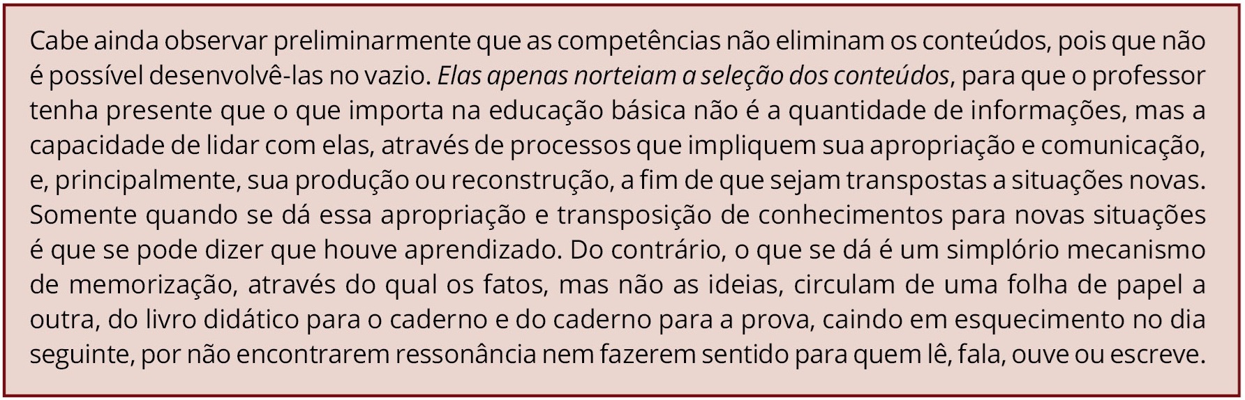 Ainda no Quadro 4, produz-se, no segundo parágrafo, uma cadeia de equivalências em que o trabalho norteado pelas competências (como critério e como objetivo das práticas educativas) é afirmado pela negação do mecanismo de memorização, associado à quantidade de informações, ao trabalho com a escrita e o livro didático, bem como aos mecanismos de avaliação.