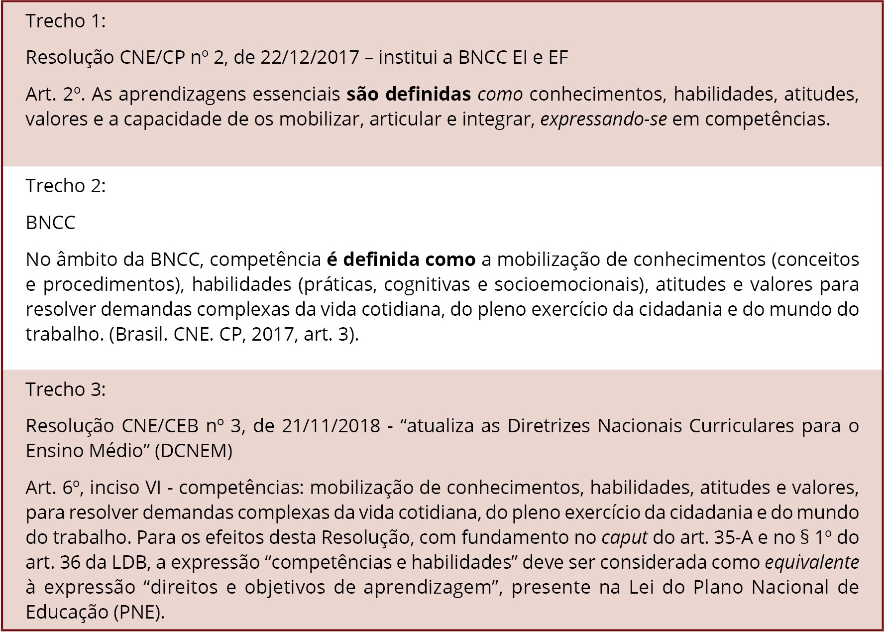 O requinte e a racionalidade desse processo podem ser identificados quando são aproximadas as passagens destacadas nos trechos de três diferentes marcos legais inseridos no Quadro 6. Nota-se um processo articulado de tentativa de fixação de sentidos por reconceitualizações: as competências definem e são a expressão das “aprendizagens essenciais”; são definidas como mobilização de conhecimentos, habilidades, atitudes e valores, e, por fim, equivalem a direitos e objetivos de aprendizagem (“a expressão ‘competências e habilidades’ deve ser considerada como equivalente à expressão ‘direitos e objetivos de aprendizagem’”).