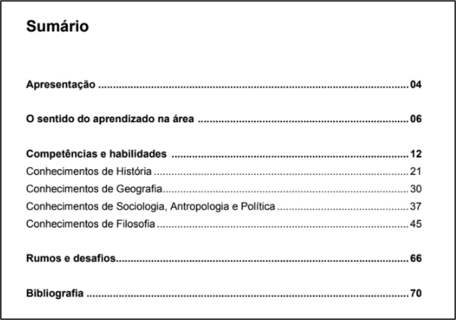 Retomando a análise comparativa, percebe-se, no trecho 3 do Quadro 2, a passagem: “é preciso destacar a necessidade de ‘romper com a centralidade das disciplinas nos currículos e substituí-las por aspectos mais globalizadores’...” (Brasil. MEC, 2018, p. 479). A assertiva “romper com a centralidade das disciplinas” traz uma ideia que não é nova em termos curriculares, uma vez que já aparecia como pressuposto instituído nos PCNEM do ano de 2000. Conforme se abordou anteriormente (Quadro 1), nos PCNEM, a área foi nomeada de Ciências Humanas e suas Tecnologias, como se nota no sumário destacado na Figura 2.
