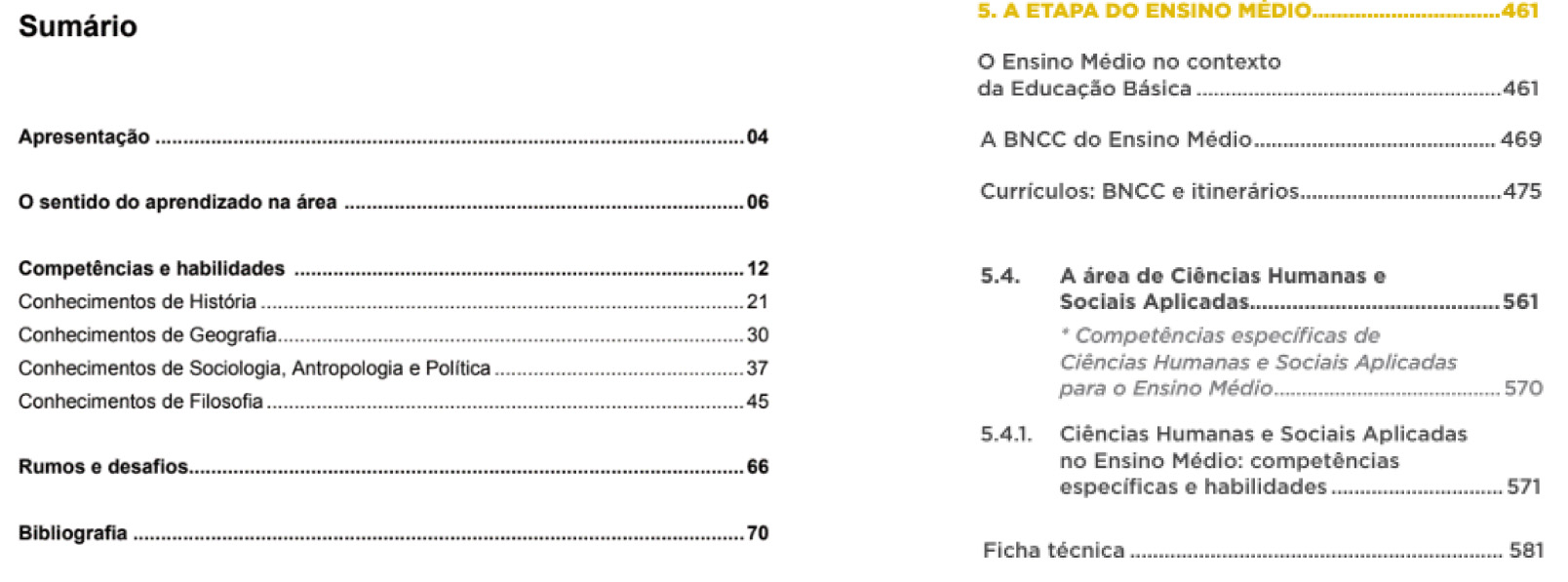Figura 3 Sumários dos PCNEM (Volume IV - Ciências Humanas) e da BNCC, respectivamente
