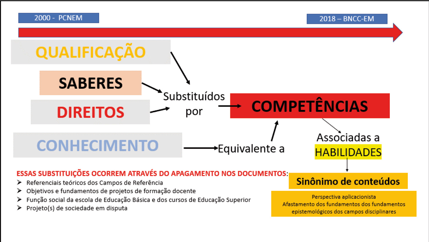 Na síntese esquemática exposta na Figura 4, ressalta-se que, no interior das políticas curriculares, como a BNCC, as competências substituíram, ao longo do tempo, uma série de significantes relacionados à formação de professores e à questão do direito à educação, por exemplo, assumindo o status de conhecimento e equivalendo-se a ele.