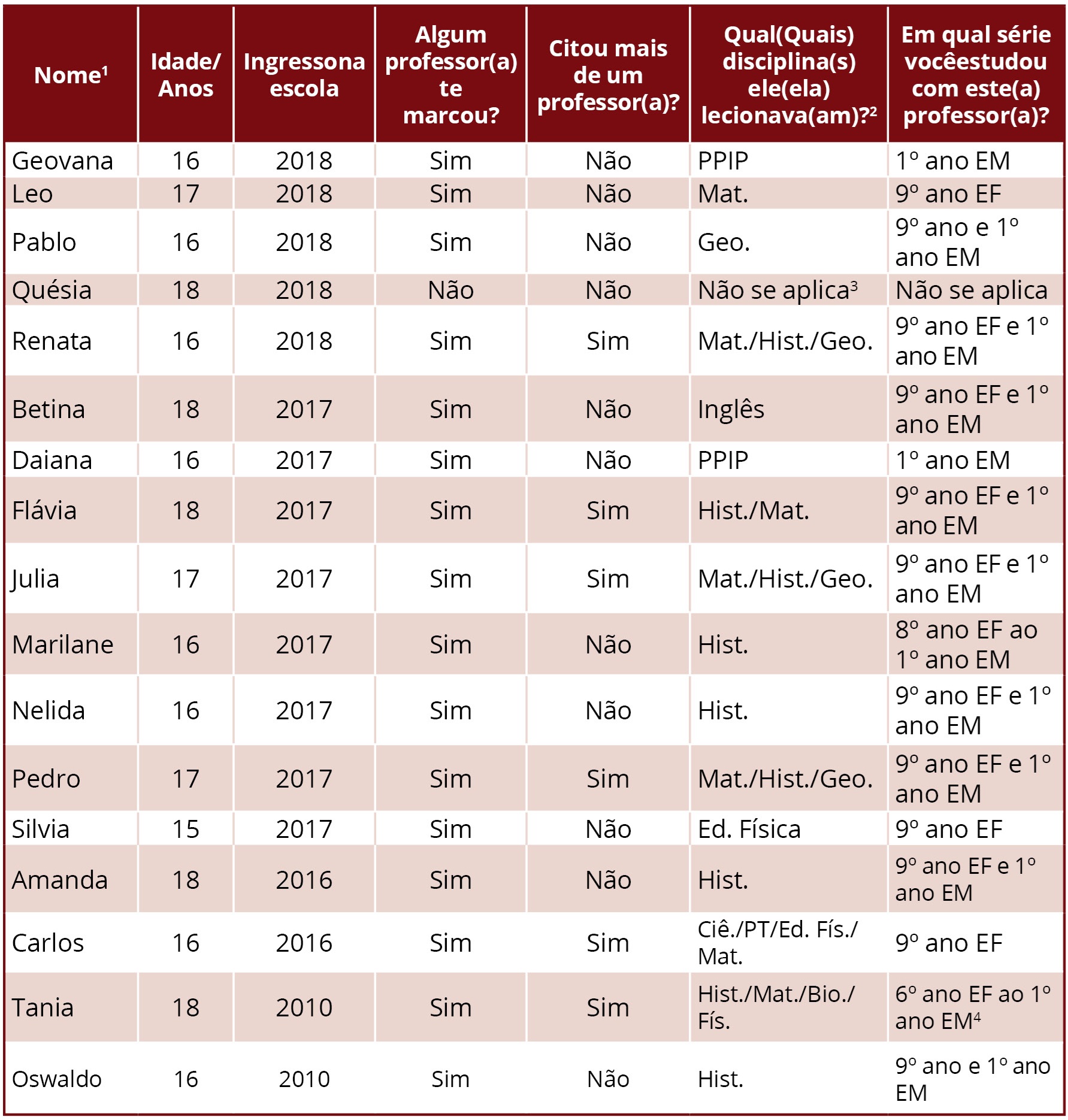 Antes, no entanto, apresentamos no Quadro 1 um breve panorama que expressa o ano de ingresso na escola envolvida, as disciplinas ministradas pelos três professores considerados marcantes e outros dados disponibilizados pelos 17 estudantes selecionados.