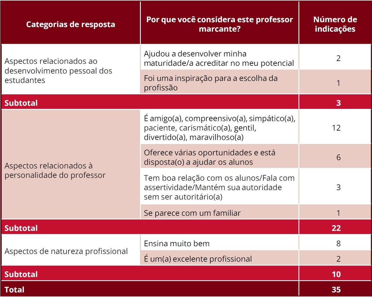 As informações contidas no Quadro 2 agrupam três diferentes categorias que totalizam 35 menções relativas aos motivos que levaram os alunos a apontarem um professor como marcante. Com o menor número de citações (três), a primeira delas revela que o professor assim designado se difere dos demais em função de suas atitudes terem contribuído para o desenvolvimento pessoal dos estudantes. Em outras palavras, os traços que diferenciam um professor marcante dos pares passam por vislumbrar e encorajar os estudantes a desenvolverem suas potencialidades, conforme apresenta este excerto que transcrevemos: “[...] além de explicar muito bem, [a professora] é muito paciente e gentil com os alunos sempre ajudando e dando bons conselhos. Ela me fez acreditar no meu potencial” (Nélida, 2019, trecho retirado do questionário).