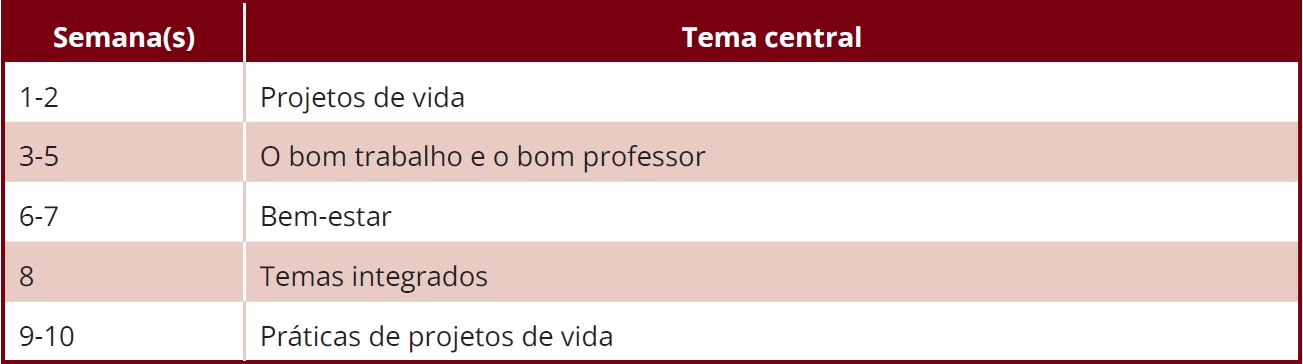 Para responder a essas perguntas, a proposta da formação consistia em encontros presenciais na escola, planejados com o objetivo de mobilizar quatro grandes temas (projetos de vida, bom trabalho, bem-estar e docência) por meio de diversas atividades e discussões ao longo da formação. Tais encontros contemplavam uma sequência de aprofundamento dos temas, entretanto, não havia pré-requisito para eles, de modo que, mesmo que um participante faltasse em algum encontro, ainda era possível participar dos demais sem prejuízo para a vivência e a compreensão.