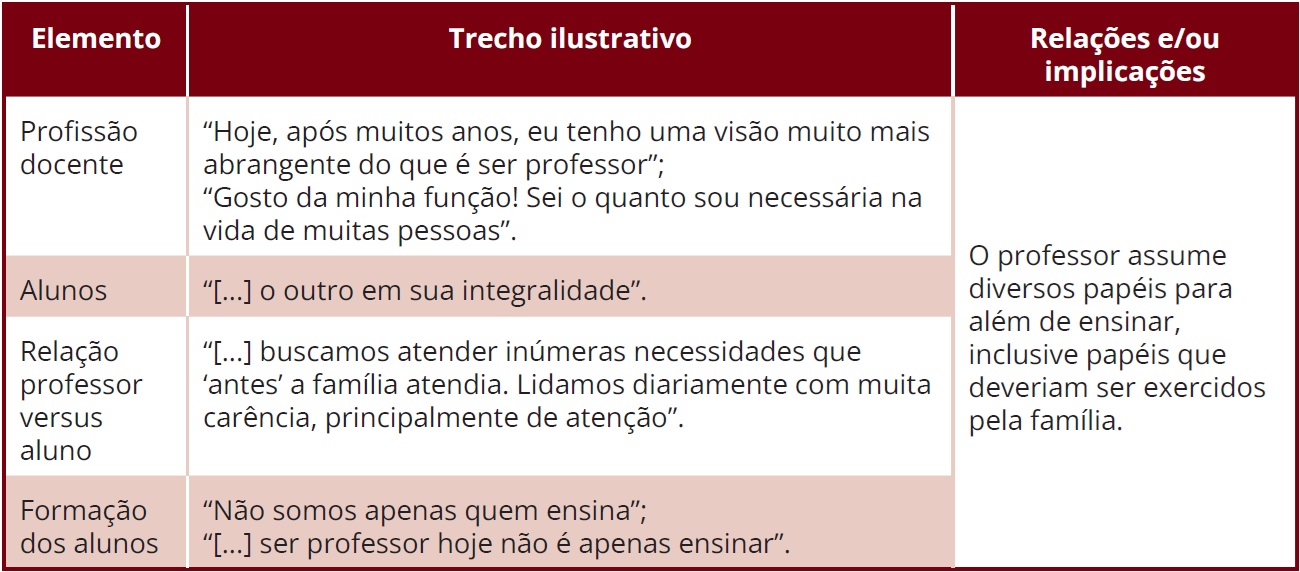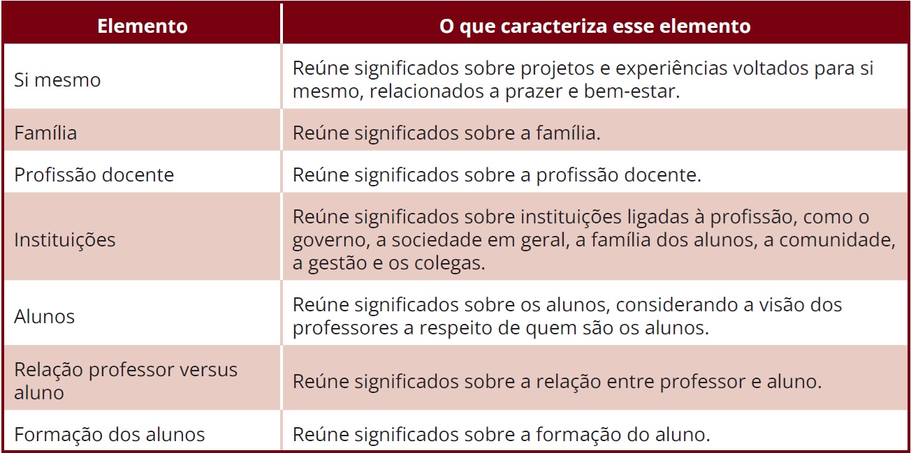 Nesta investigação, buscamos identificar os elementos, seus significados e as possíveis relações e/ou implicações entre eles que apareciam nas representações dos professores participantes. Nesse processo, emergiram os elementos si mesmo, família, profissão docente, instituições, alunos, relação professor versus aluno, e formação do aluno, com base nos quais analisamos os significados e as relações e/ou implicações estabelecidas entre todos eles. O Quadro 2 detalha esses elementos.