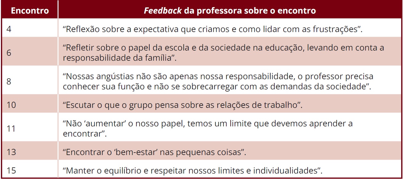 Durante a formação, a professora expressa, de forma consciente, sentimentos em relação às suas angústias com a profissão, defendendo, ao final dos encontros, a necessidade de limites e equilíbrio (Quadro 4). Além disso, o bem-estar é citado de forma nominal no décimo terceiro encontro, quando ela o apresenta como feedback da experiência que a mobilizou a pensar sobre “Encontrar o ‘bem-estar’ nas pequenas coisas”.